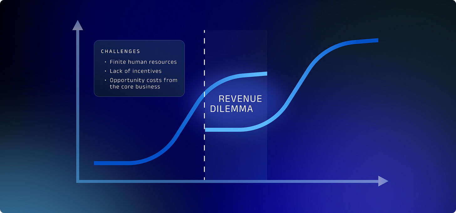 You’re stuck in The Revenue Dilemma. It’s like the classic Innovator’s Dilemma, where incumbents prioritize their existing products instead of investing to develop new ones, and miss chances to block disruption by competitors. With The Revenue Dilemma, businesses prioritize their existing revenue streams over investing in developing new streams, and miss chances to grow faster than competitors.